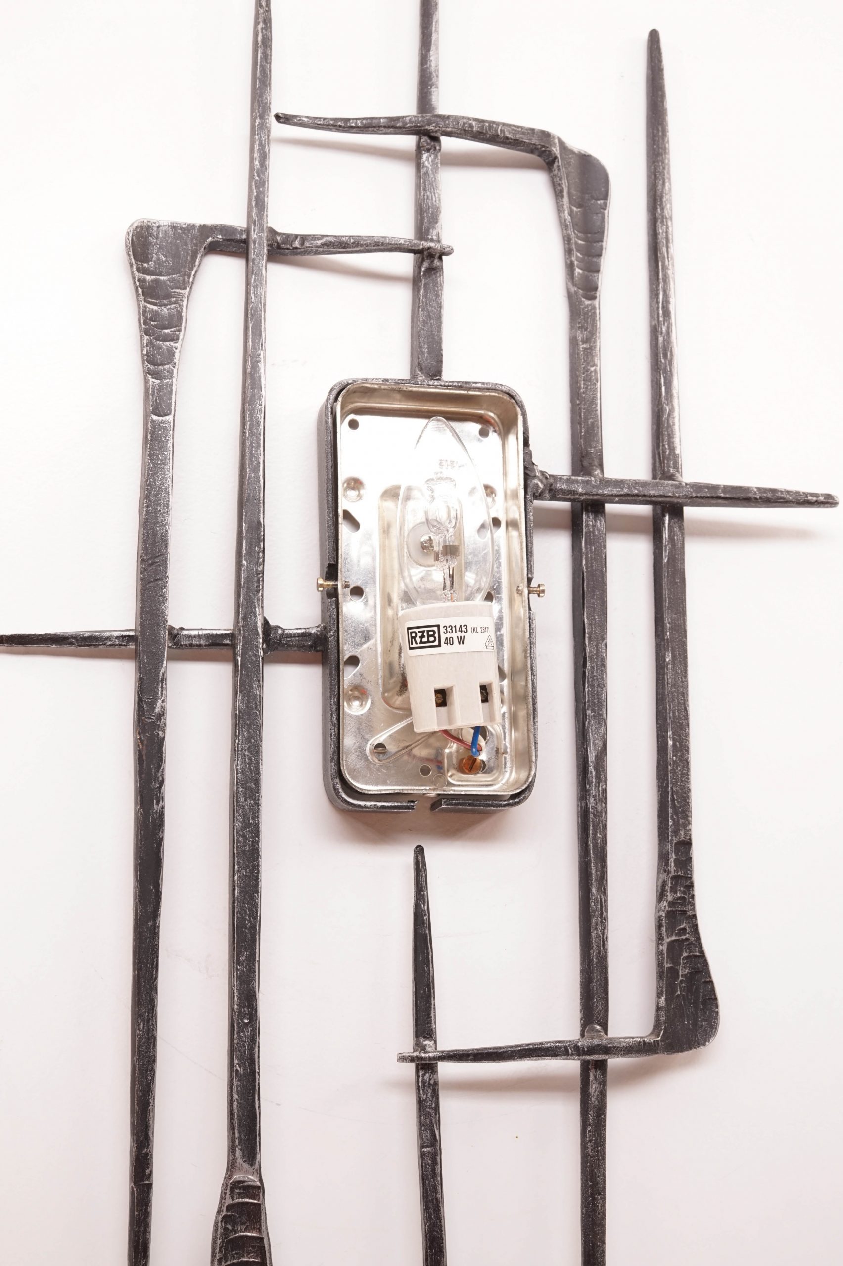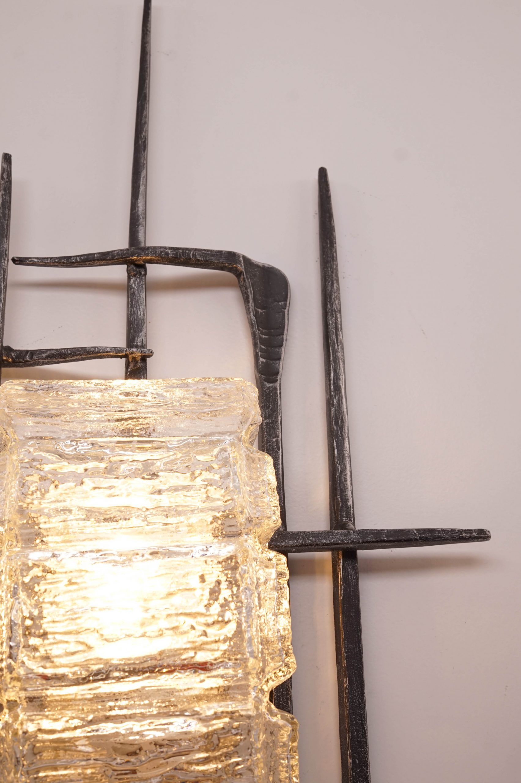 This vintage Brutalist wall lamp features a heavy, textured ice-glass cover secured within a handcrafted wrought-iron frame. It remains in very good vintage condition; the minimal patina on the metal is consistent with its age and enhances its authentic mid-century character. Although the designer and manufacturer are unknown, the lamp is an exceptional piece of sculptural lighting.